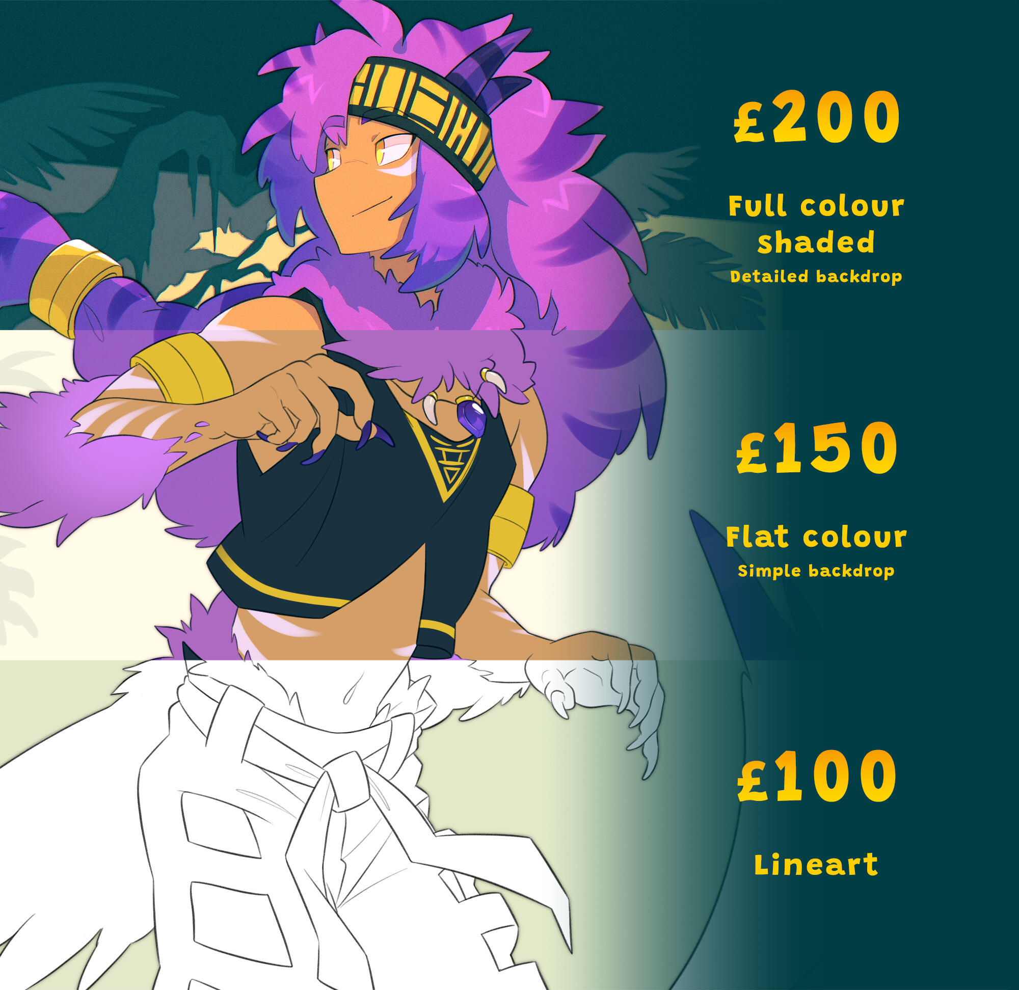 Price may change depending on the complexity of your character.Flat price includes simple shading and lighting. If you would prefer flat colours then the price will be amended accordingly. See examples for variations in style and colour.